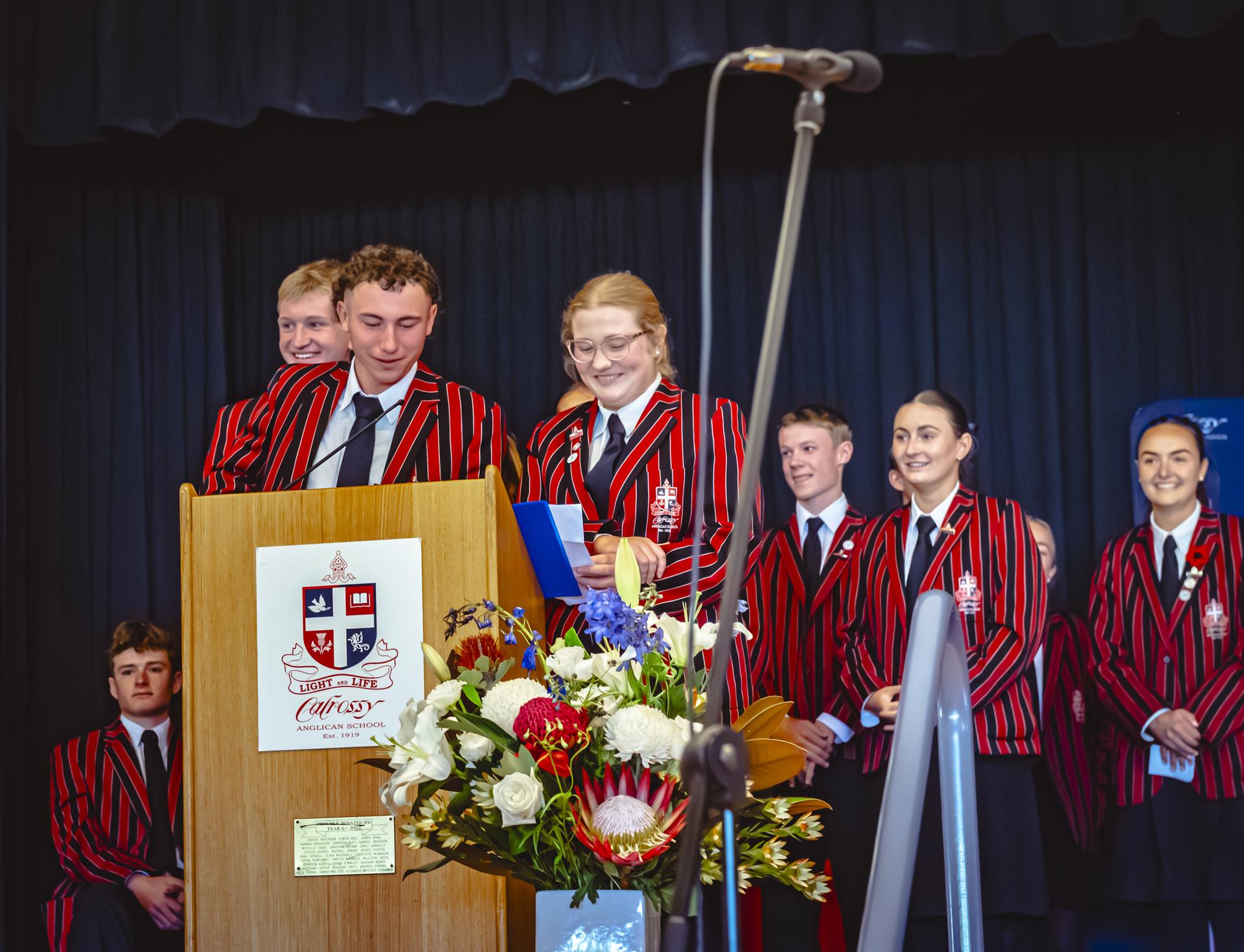 A special moment followed as Junior School Leaders presented a cheque to Chair of the Calrossy Foundation, Mrs Louise Ingall. The funds, raised through the Year 12 legacy gift, will go towards supporting future students via the Foundation’s Bursary Fund—a lasting contribution that will continue their story of generosity and service.