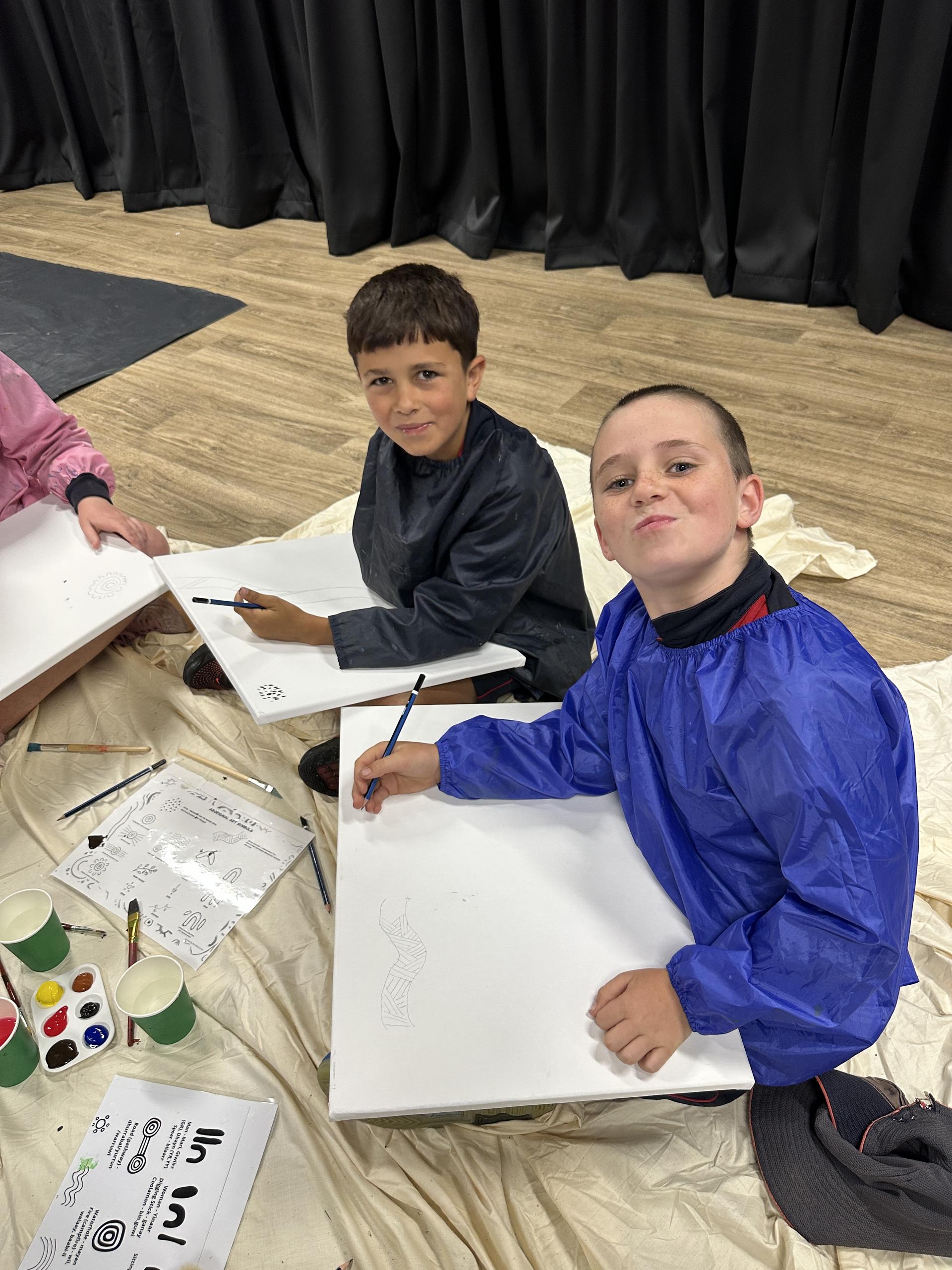 Younger students (K–4) joined in the morning session, working alongside older peers before sharing morning tea with the community. Students in Years 5–11 remained for the full day, with senior students working on possum skins, and others creating beautiful canvas artworks.