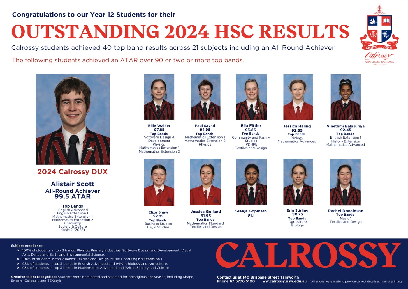 - Ten students achieved ATARs over 90, led by Calrossy Dux Alistair Scott.